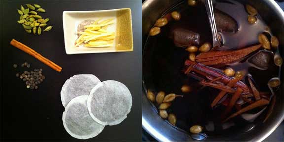 Put the tea bags, cardamom, peppercorns, cinnamon stick, ginger and water in a pot. Bring to boil and decrease temperature and simmer for about 5 minutes. Take off the stove, and remove the tea bags. Add the sugar and stir until the sugar has melted. Leave the syrup in the pot until it has cooled down. This will increase the spice flavour in the syrup. Once cooled, transfer to a bottle and store in the fridge.