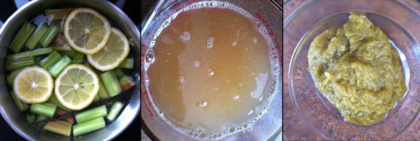In a pot add the rhubarb, vanilla bean and pod, lemon, and sugar. Add enough water to cover the rhubarb, about 4 cups. Boil then simmer for about 15 minutes until the rhubarb is mushy. The rhubarb should be the consistency of the image on the far right.