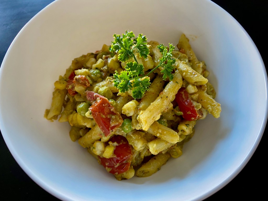1. In a pot add the pasta, corn and peas into salted water and cook until the pasta is the consistency that you like.